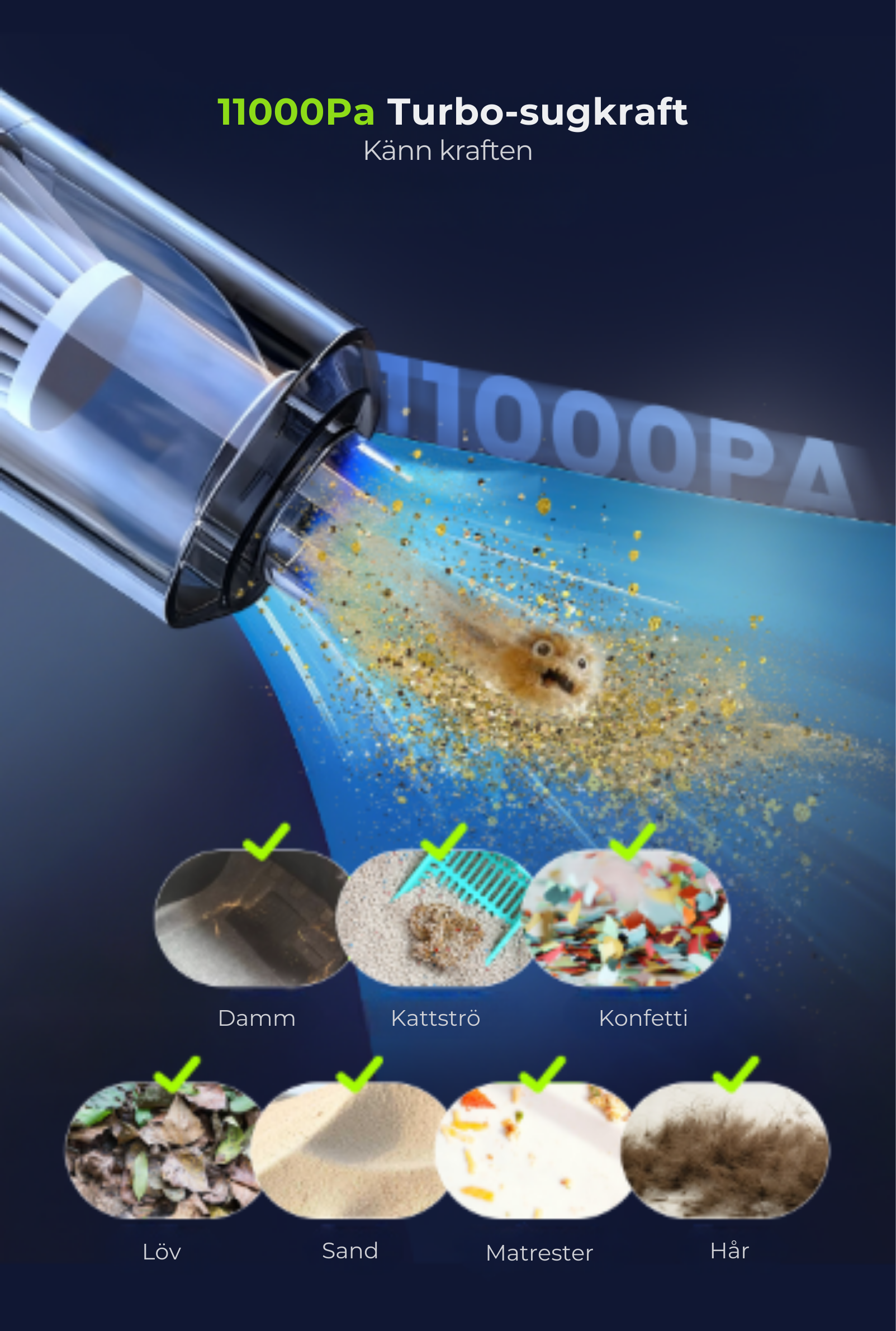 Den kraftfulla sugförmågan tar hand om både synlig smuts och de små partiklarna som annars stannar kvar.