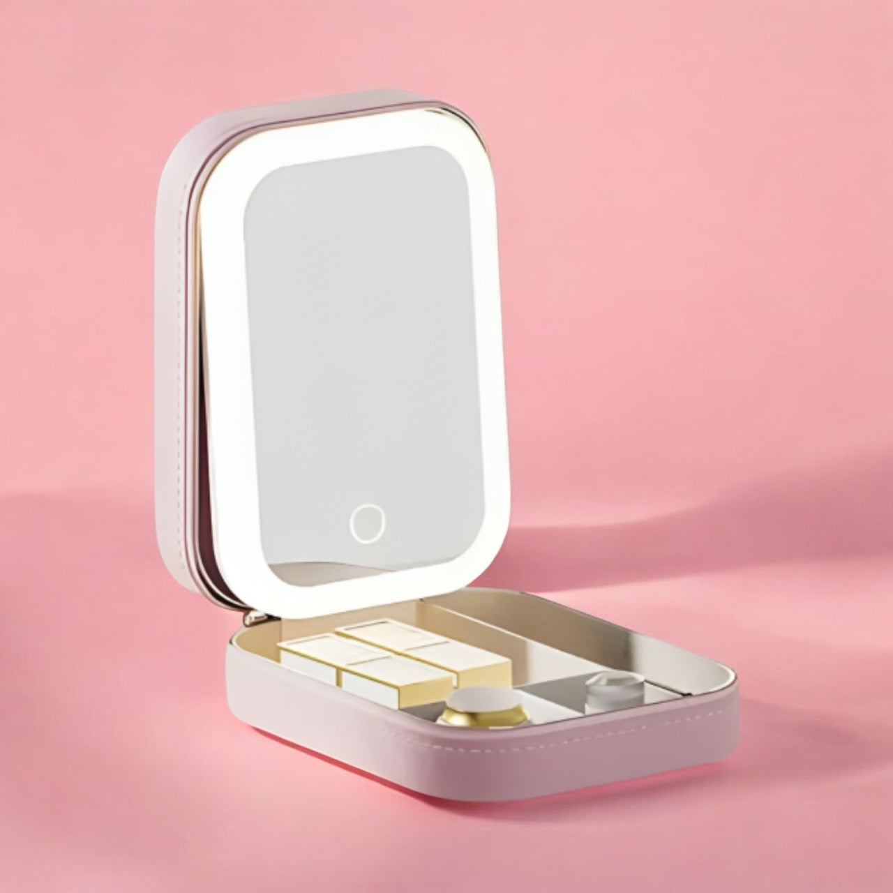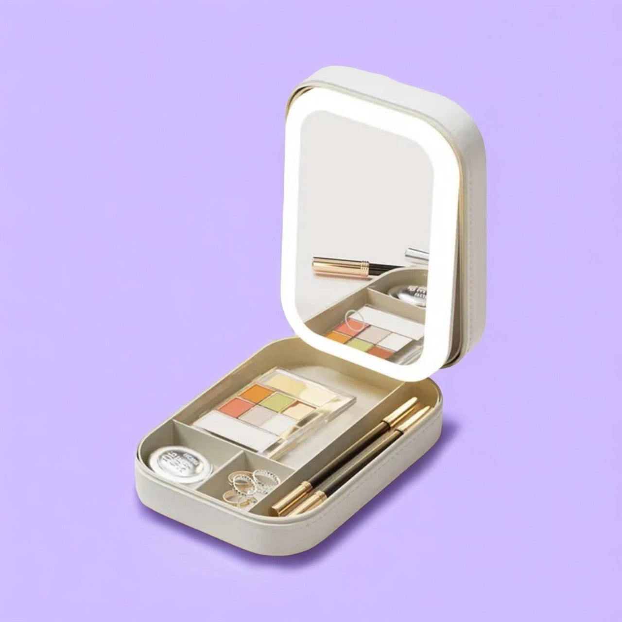 GlowBox™ är en kompakt sminkbox med inbyggd ljusspegel som ger dig ett perfekt ljus var du än befinner dig. Det mjuka, jämna ljuset framhäver dina drag och gör varje justering trygg och enkel. Den är lätt nog att rymmas i din handväska, men robust nog att kännas som en liten personlig studio. Perfekt för snabba touch-ups, fulla looks eller när du bara behöver se dig själv på riktigt.
