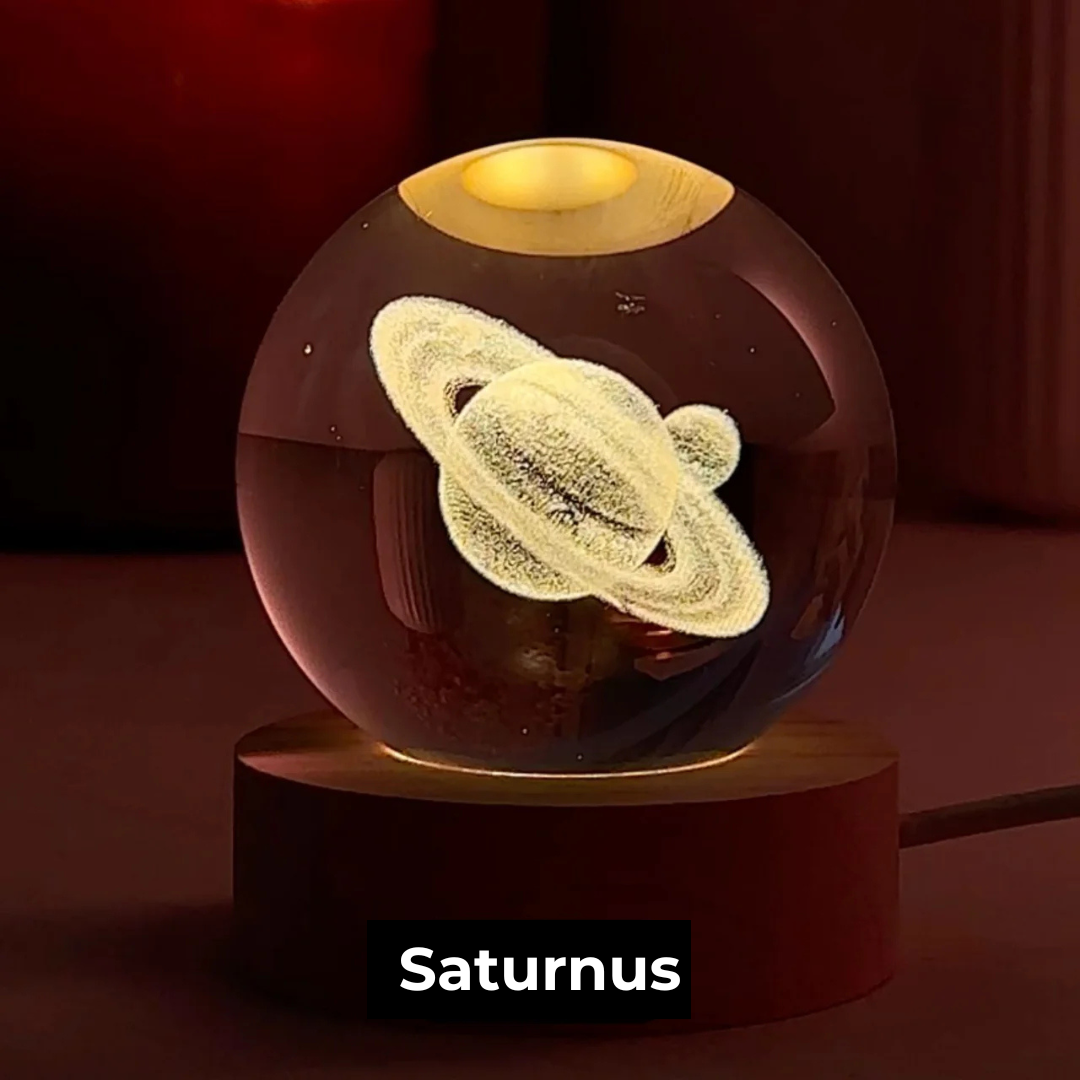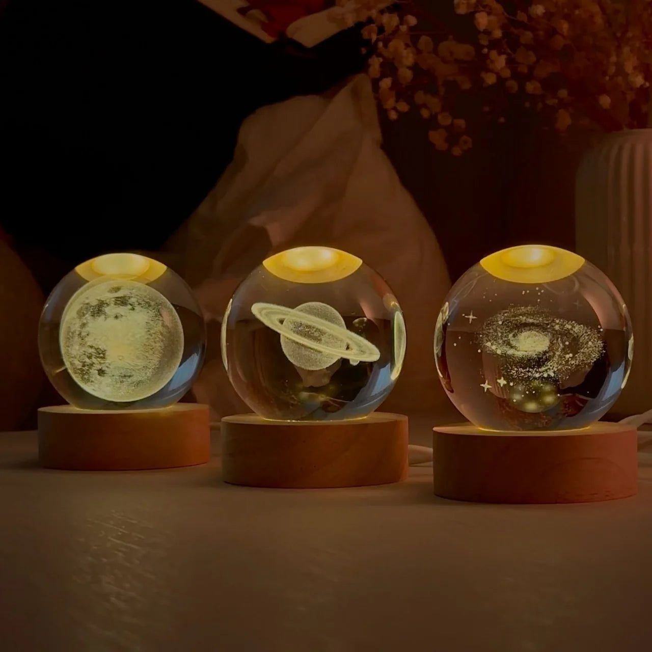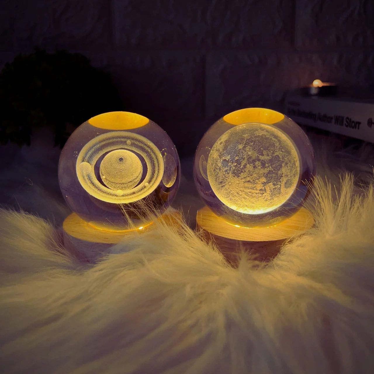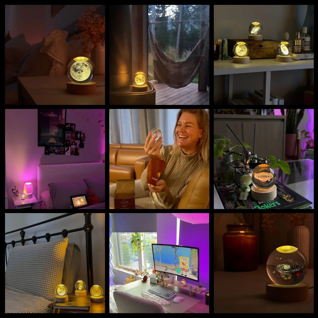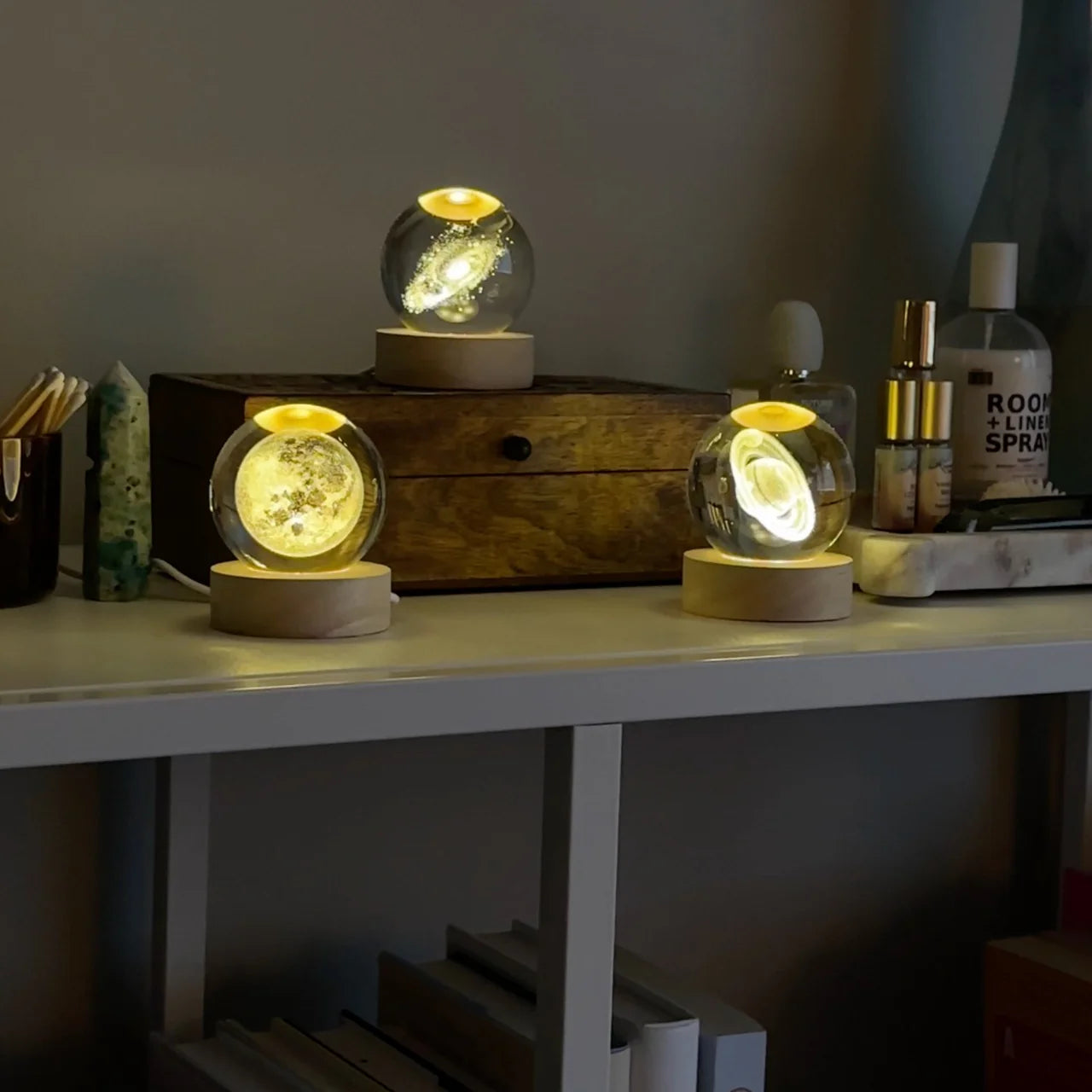 Upplev hur en kristallklar sfär, graverad med laserprecision, fångar rymdens detaljer och sprider ett mjukt, varmt sken över ditt hem.