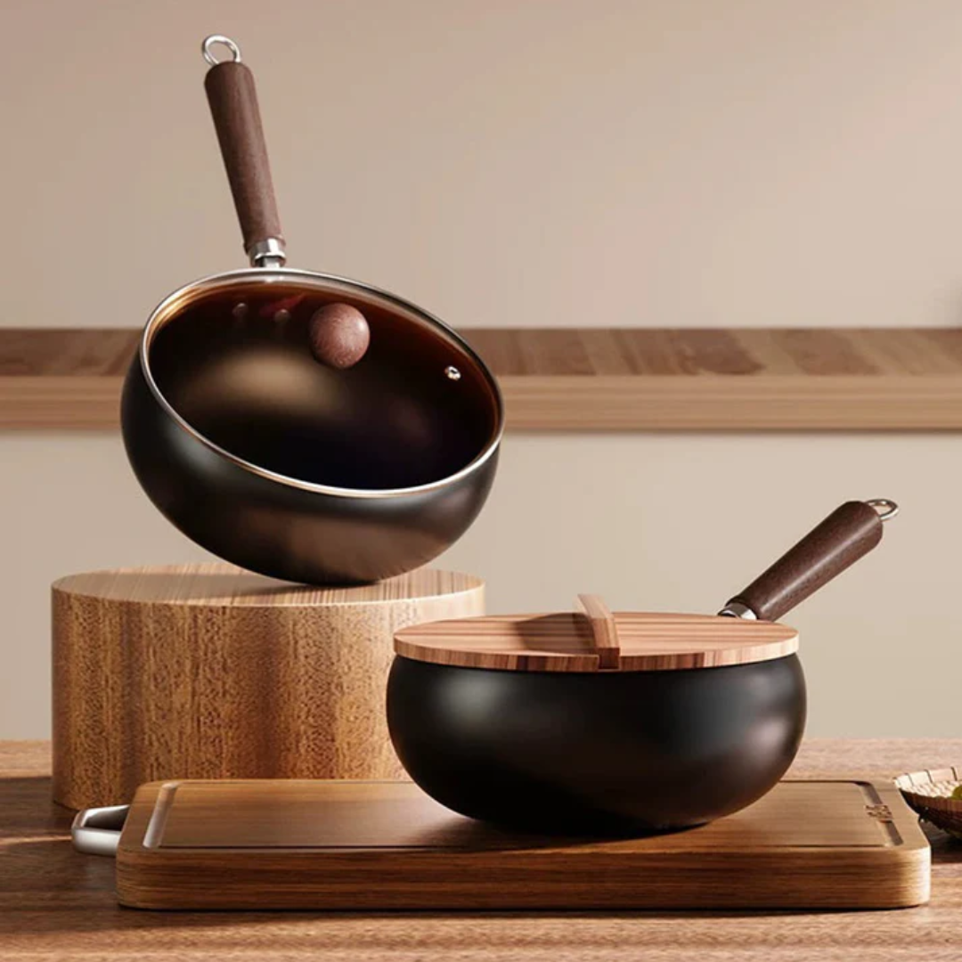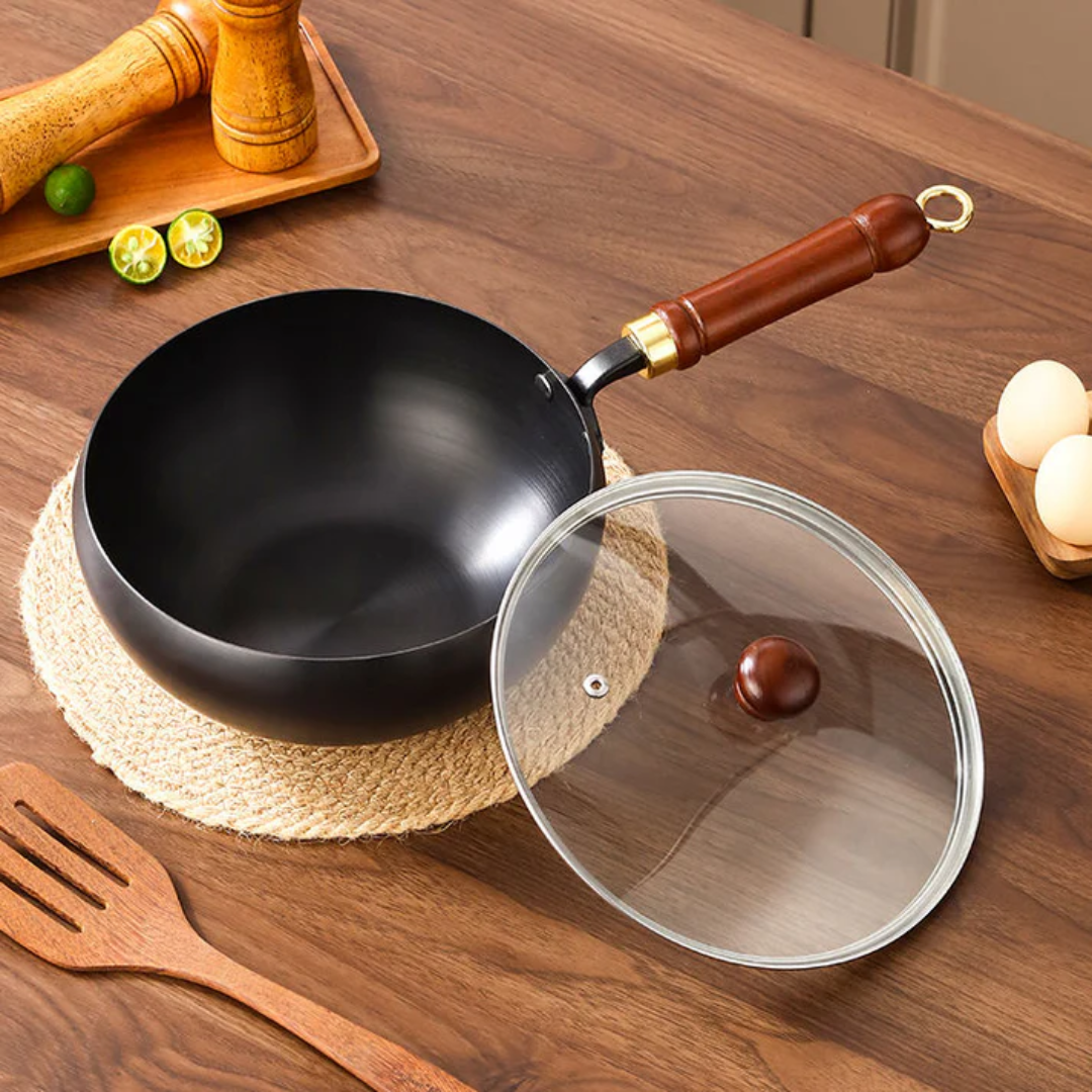 Det ergonomiska trähandtaget håller sig svalt och ger ett bekvämt grepp, så att du kan njuta av matlagningen med stil och säkerhet.