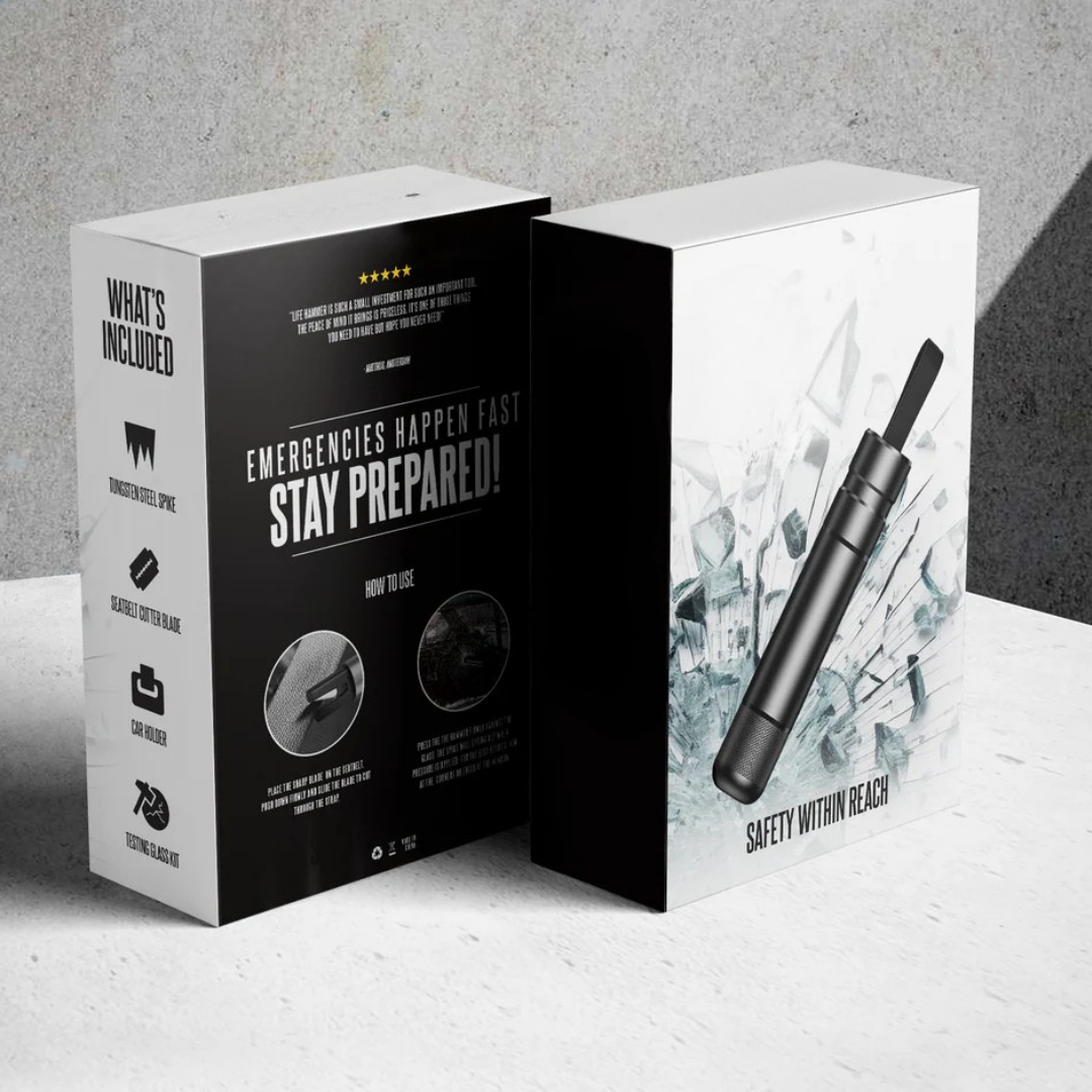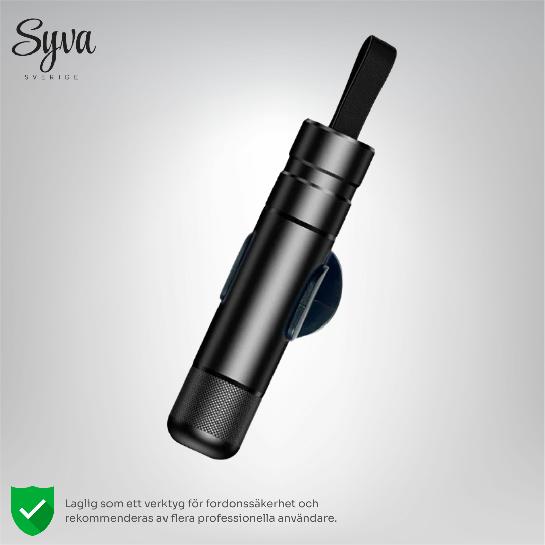 LivsHammare™ är ett kompakt nödverktyg som är utformat för att hjälpa dig att snabbt ta dig ut ur din bil i farliga situationer. Den krossar rutor med en enda tryckning och skär enkelt igenom säkerhetsbälten.