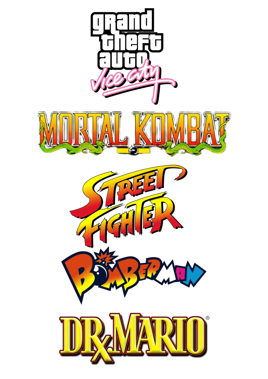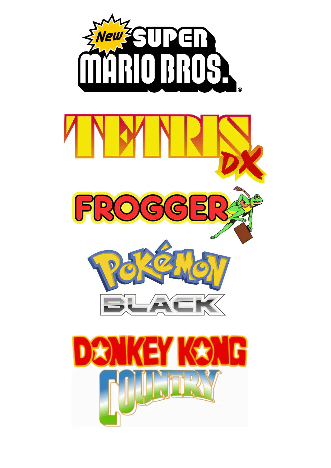 - Klassiker: Super Mario Bros, Donkey Kong, Sonic the Hedgehog, Pokémon Red/Blue/Yellow