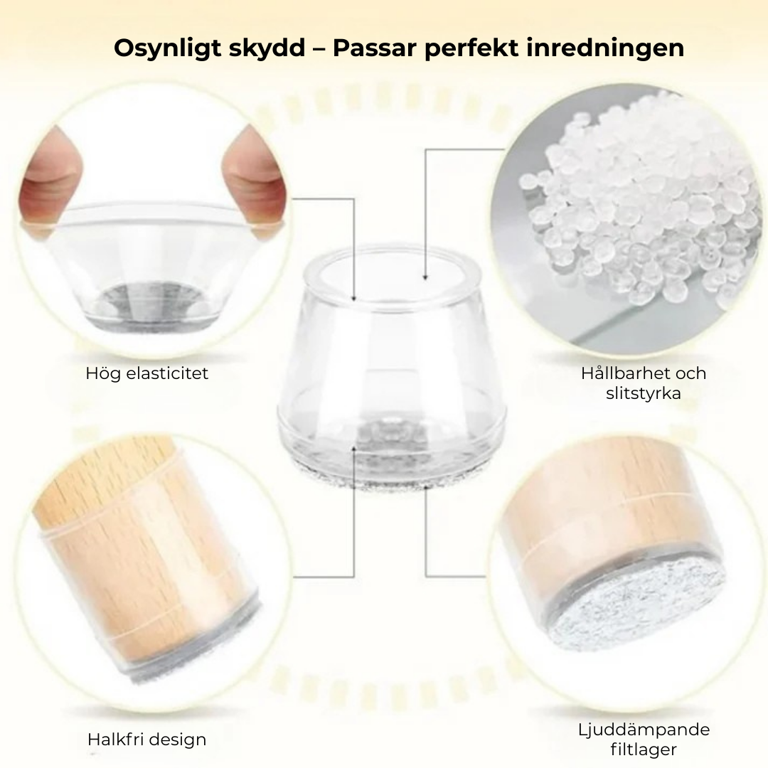SkrapFri™ löser detta problem omedelbart. Flexibel silikon omsluter stolsbenen tätt, och den mjuka filtbasen gör att stolen glider obehindrat över golvet – utan skador eller ljud. Inget mer irriterande gnisslande. Inga fler skadade golv. Inget mer byte av limmade dynor med några månaders mellanrum.