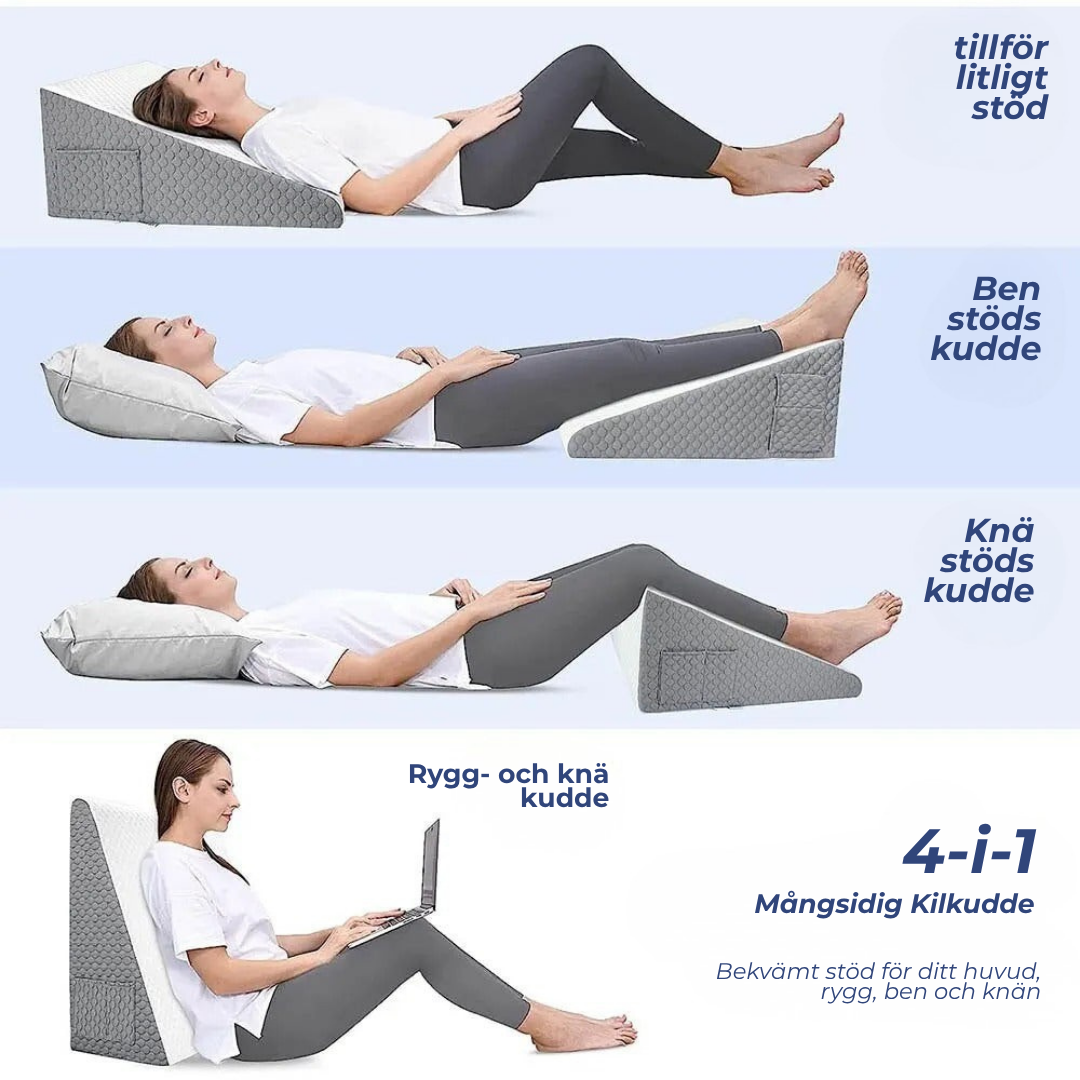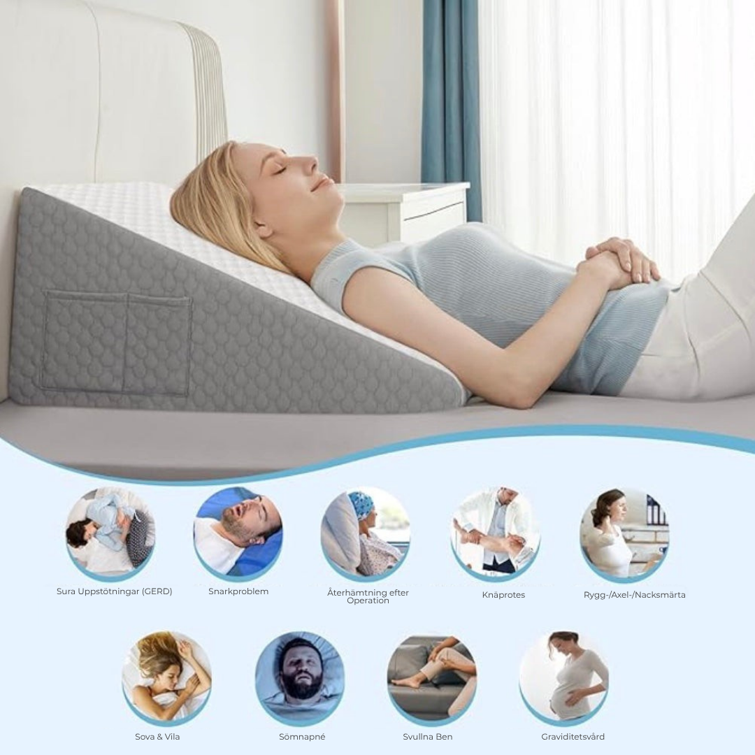 Sleqo™ hjälper mot snarkning, sömnapné, sura uppstötningar, morgonhuvudvärk, nack- och ryggsmärta, bihålebesvär och återhämtning efter operation – samtidigt som den stödjer ryggradens linjering och lindrar graviditetsrelaterat obehag.