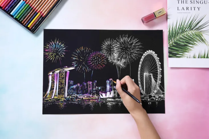 Med det medföljande verktyget skrapar du försiktigt fram linjer, detaljer och färger — lager för lager.