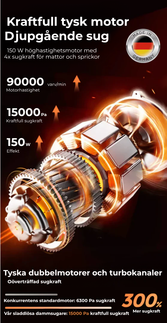- Kraftfull sugteknologi – 15 000 Pa, tar bort även envis smuts, hår och partiklar