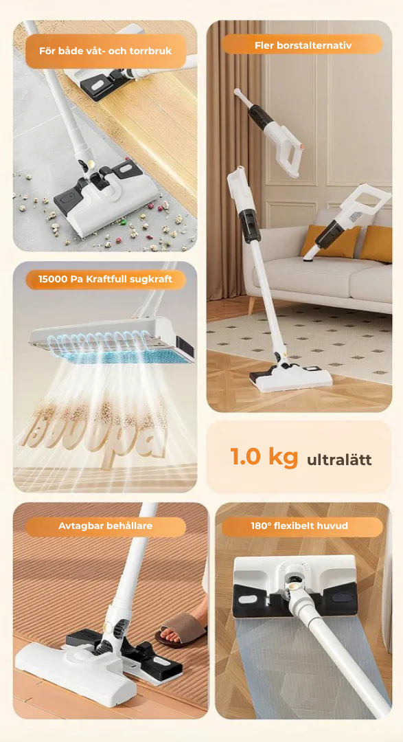 - Multifunktionell rengöring – dammsugning, våtmoppning och textilrengöring i samma verktyg